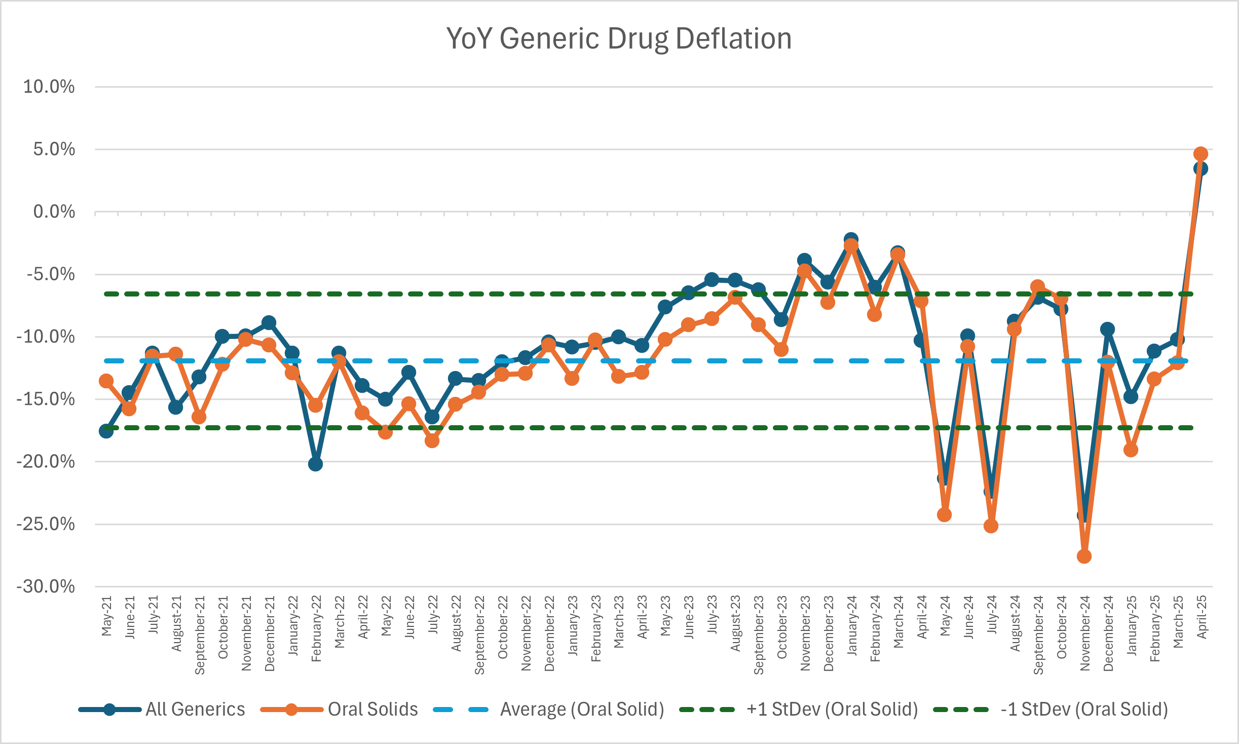 We have seen, and come to expect, that when we measure generic NADAC changes YoY, we will see deflation (that is declining prices relative to last year). We’ve come to expect that, because it is what we’ve seen for the entirety of the five years we’ve been running the numbers; that is until April 2025. In April 2025, we observed for the first time YoY generic inflation – not deflation. See Figure 1: