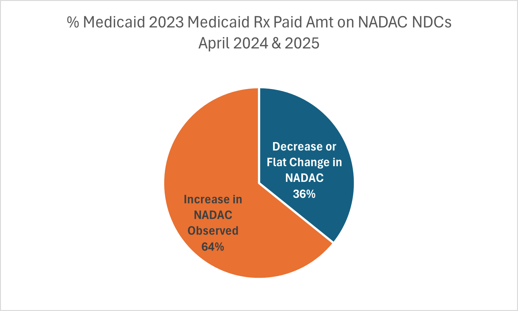 Generic drugs are generally cheap (as demonstrated by an average NADAC per Rx of approximately $11 or an average Medicaid payment per Rx of approximately $20 per Rx). As a result, a 3% increase in generic NADAC costs from April 2024 to April 2025 means that what previously was $10.92 is now $11.27; or $0.36 more expensive per prescription (can you break a dollar?).